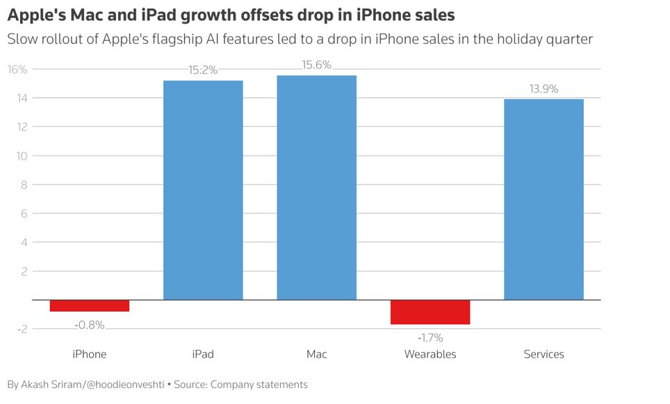 Mac sales also increased during the last quarter due to the launch of new lines, including iMacs, Mac Minis, and MacBook Pros with a new M4 chip. Apple Intelligence features are more widely available on iPads and Apple Macs, as larger sizes mean more powerful chips.