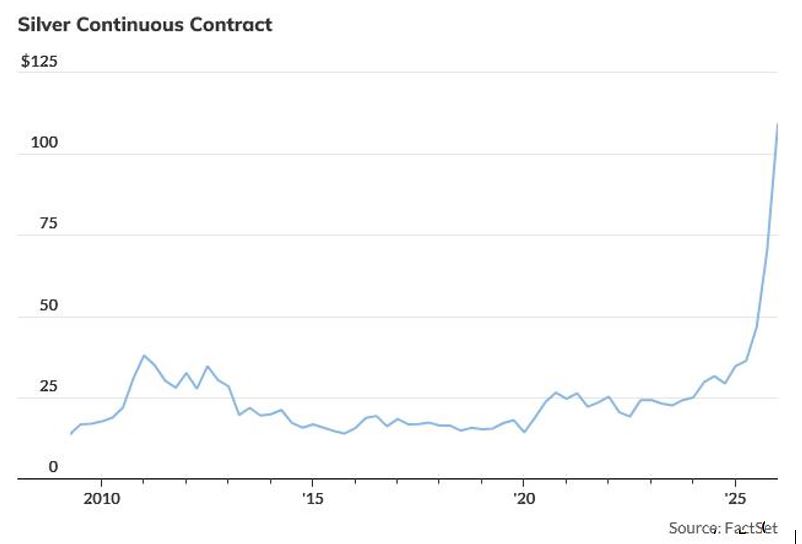 The most recent LSEG Workspace data shows the VXSLSLV (Silver Volatility Index) is trading above 106 and intraday reached as high as 124. In regard to market expectation, this number indicates that investors are pricing in risk for daily price variation of approximately 7% (which is extraordinarily rare for traditional hard asset classes such as precious metals).