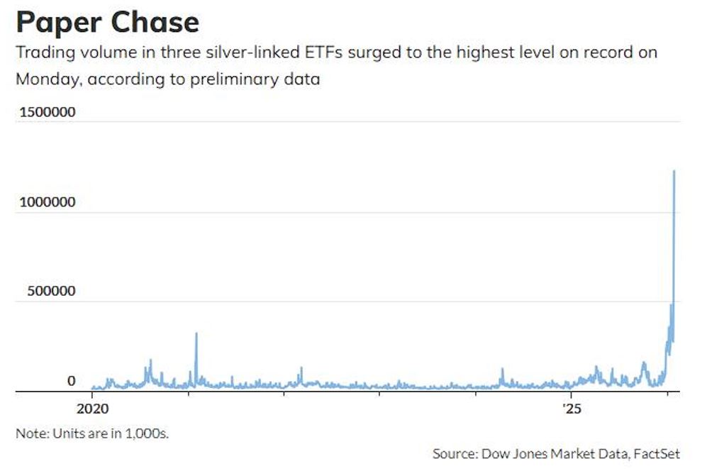 According to Dow Jones Market Data, the most heavily traded exchange-traded funds in the U.S. on Monday were two silver ETFs. The most traded silver ETF by volume was the ProShares UltraShort silver ETF (ZSL), with approximately 800 million shares changing hands, which is a clear indication that several investors remain sceptical about the meteoric rise in silver prices and are making reverse trades with respect to silver.